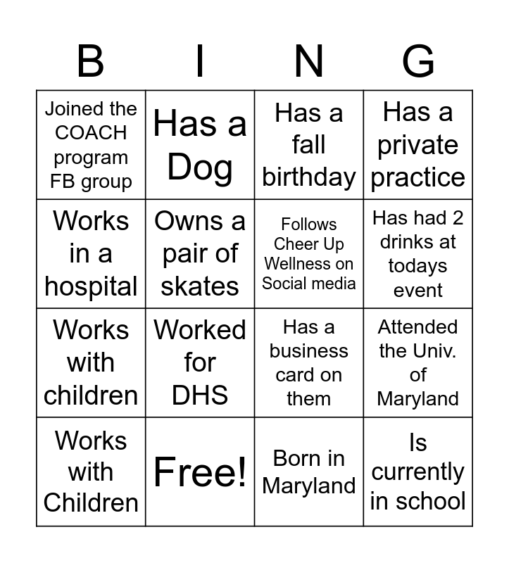 This bingo card has 22 words: Free!, Worked out tody, Has a Dog, Wearing a Belt, Owns a pair of skates, Follows Cheer Up Wellness on Social media, Joined the COACH program FB group, Has a fall birthday, Has a business card on them, Is currently in school, Works with children, Has a private practice, Lives outside of Baltimore city, Plays an instrument, Born in Maryland, Left Handed, Attended the Univ. of Maryland, Works with Children, Worked for DHS, Works in a hospital, Has had 2 drinks at todays event and Plays an instrument.