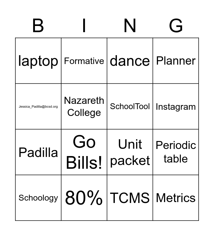 This bingo card has 16 words: 80%, Periodic table, dance, laptop, Padilla, Formative, Unit packet, TCMS, Jessica_Padilla@bcsd.org, Nazareth College, Schoology, Planner, Go Bills!, Instagram, SchoolTool and Metrics.