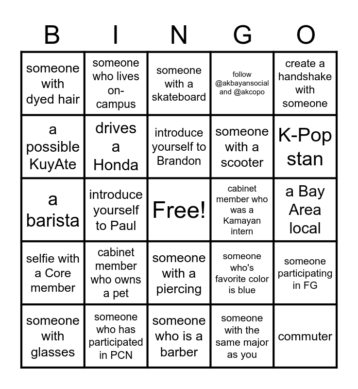 This bingo card has a free space and 24 words: cabinet member who owns a pet, someone who has participated in PCN, introduce yourself to Brandon, someone with glasses, create a handshake with someone, someone with dyed hair, a possible KuyAte, someone who lives on-campus, cabinet member who was a Kamayan intern, someone with a piercing, someone with a scooter, a barista, someone who's favorite color is blue, someone participating in FG, drives a Honda, someone with the same major as you, a Bay Area local, someone with a skateboard, K-Pop stan, introduce yourself to Paul, commuter, selfie with a Core member, follow @akbayansocial and @akcopo and someone who is a barber.