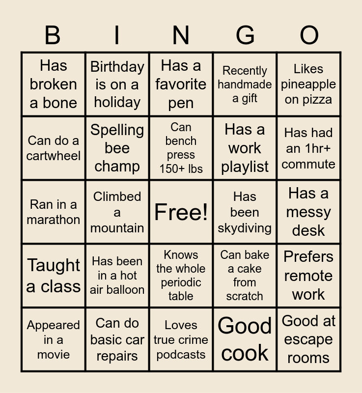 This bingo card has a free space and 34 words: Never flown on an airplane, Good cook, Wearing funny socks, Collects something, Taught a class, Spelling bee champ, Likes pineapple on pizza, Appeared in a movie, Birthday is on a holiday, Met a celebrity, Can bench press 150+ lbs, Has a favorite pen, Does standup comedy, Can hula hoop, Has been skydiving, Has had an 1hr+ commute, Can do basic car repairs, Ran in a marathon, Has been in a hot air balloon, Can bake a cake from scratch, Knows the whole periodic table, Has 0 unread emails, Has broken a bone, Has a messy desk, Loves true crime podcasts, Good at escape rooms, Recently handmade a gift, Prefers working in office, Has a work playlist, Can do a cartwheel, Won an eating competition, Climbed a mountain, Prefers remote work and Drinks 3+ cups coffee a day.
