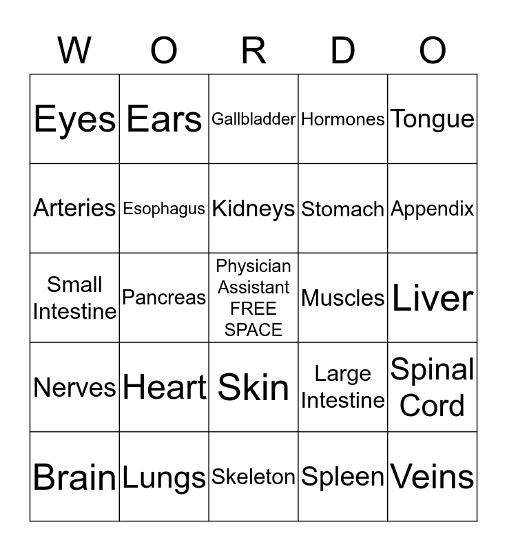 This bingo card has a free space and 24 words: Heart, Lungs, Kidneys, Brain, Tongue, Eyes, Arteries, Ears, Muscles, Skin, Stomach, Small Intestine, Large Intestine, Spinal Cord, Esophagus, Spleen, Liver, Gallbladder, Appendix, Pancreas, Veins, Nerves, Hormones and Skeleton.