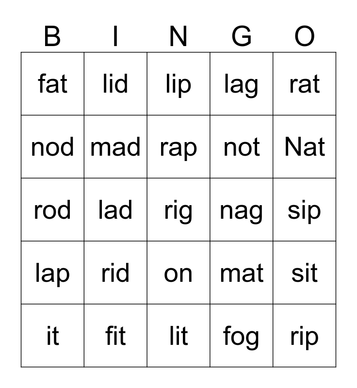 This bingo card has 36 words: sad, sat, sap, mad, mat, lap, rap, rag, rat, map, lad, lag, nap, nag, Nat, fat, rip, rid, rig, lip, sip, sit, fit, it, lit, lid, rod, rot, not, nod, lot, log, fog, on, Rod and mop.