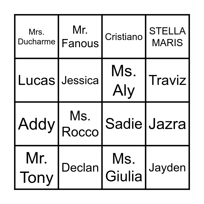 This bingo card has 16 words: Declan, Jazra, Cristiano, Mrs. Ducharme, Addy, Mr. Fanous, Sadie, Ms. Giulia, Lucas, Jessica, Mr. Tony, STELLA MARIS, Ms. Rocco, Traviz, Ms. Aly and Jayden.