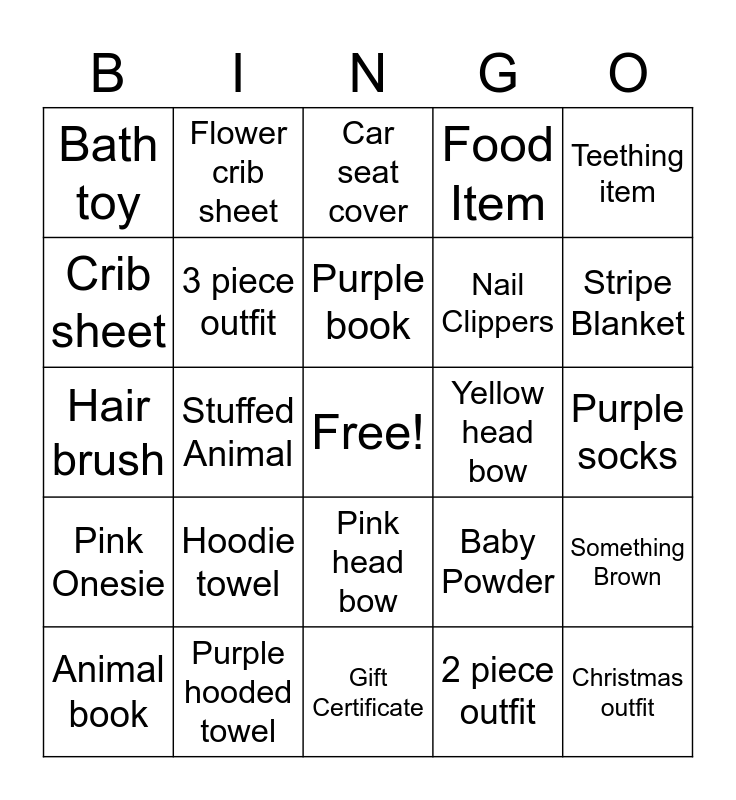 This bingo card has a free space and 24 words: Hoodie towel, Purple hooded towel, Purple book, Animal book, Teething item, Bath toy, Crib sheet, Flower crib sheet, Yellow head bow, Pink head bow, Nail Clippers, Hair brush, Baby Powder, Something Brown, 3 piece outfit, 2 piece outfit, Purple socks, Car seat cover, Stripe Blanket, Stuffed Animal, Christmas outfit, Pink Onesie, Food Item and Gift Certificate.