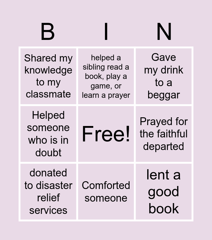 This bingo card has a free space and 17 words: made sandwiches and hand them out to homeless people, reminded a sibling or friend of the rules, Gave my drink to a beggar, Shared my knowledge to my classmate, Gave away clothes to those who are in need., Helped someone who is in doubt, Sent help to the imprisoned, donated to disaster relief services, Comforted someone, Prayed for the faithful departed, does not gossip about the bad behavior of others, Forgave someone, lent a good book, helped a sibling read a book, play a game, or learn a prayer, visits the cemetery, especially in November, attended a funeral and did the laundry.