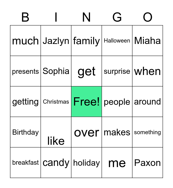 This bingo card has a free space and 24 words: like, candy, get, breakfast, Miaha, much, presents, Jazlyn, people, over, surprise, getting, makes, something, Sophia, me, around, family, when, Christmas, Paxon, Birthday, Halloween and holiday.