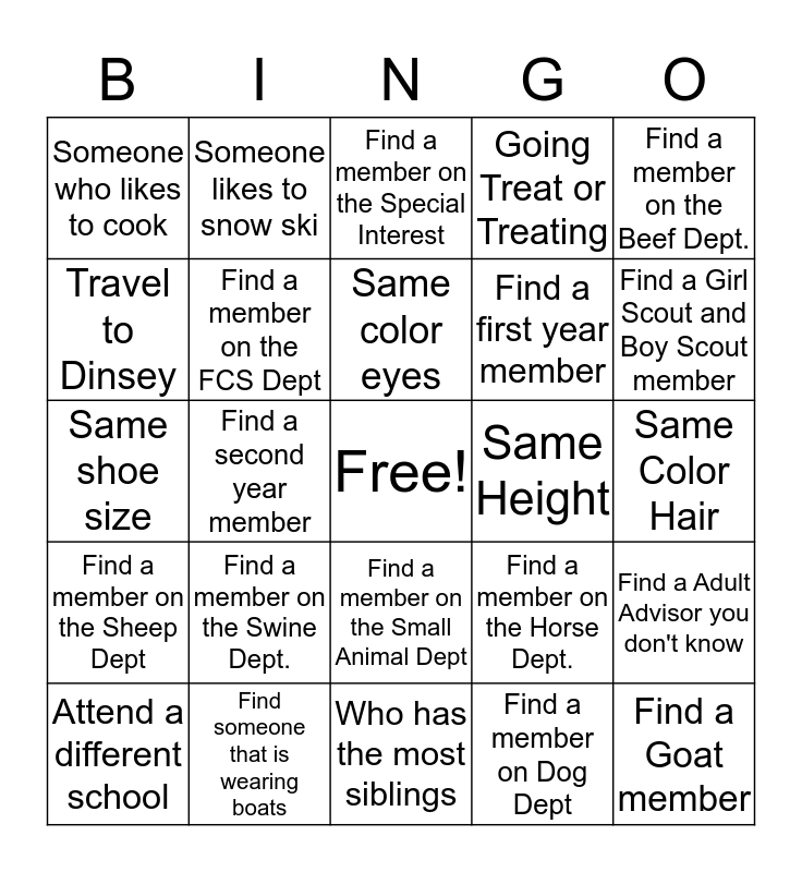 This bingo card has a free space and 24 words: Find a member on the Swine Dept., Find someone that is wearing boats, Same color eyes, Attend a different school, Find a member on the Beef Dept., Someone who likes to cook, Travel to Dinsey, Someone likes to snow ski, Same Height, Find a member on the Small Animal Dept, Find a first year member, Same shoe size, Find a member on the Horse Dept., Find a Adult Advisor you don't know, Find a member on the FCS Dept, Find a member on Dog Dept, Same Color Hair, Find a member on the Special Interest, Find a Girl Scout and Boy Scout member, Find a second year member, Find a Goat member, Find a member on the Sheep Dept, Going Treat or Treating and Who has the most siblings.