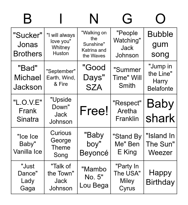 This bingo card has a free space and 24 words: Curious George Theme Song, "Talk of the Town" Jack Johnson, "Good Days" SZA, "Just Dance" Lady Gaga, Bubble gum song, "Sucker" Jonas Brothers, "Bad" Michael Jackson, "I will always love you" Whitney Huston, "Respect" Aretha Franklin, "Baby boy" Beyoncé, "Summer Time" Will Smith, "L.O.V.E" Frank Sinatra, "Stand By Me" Ben E King, "Island In The Sun" Weezer, "September" Earth, Wind, & Fire, "Party In The USA" Miley Cyrus, Baby shark, "Walking on the Sunshine" Katrina and the Waves, "Jump in the Line" Harry Belafonte, "Upside Down" Jack Johnson, Happy Birthday, "Ice Ice Baby" Vanilla Ice, "People Watching" Jack Johnson and "Mambo No. 5" Lou Bega.