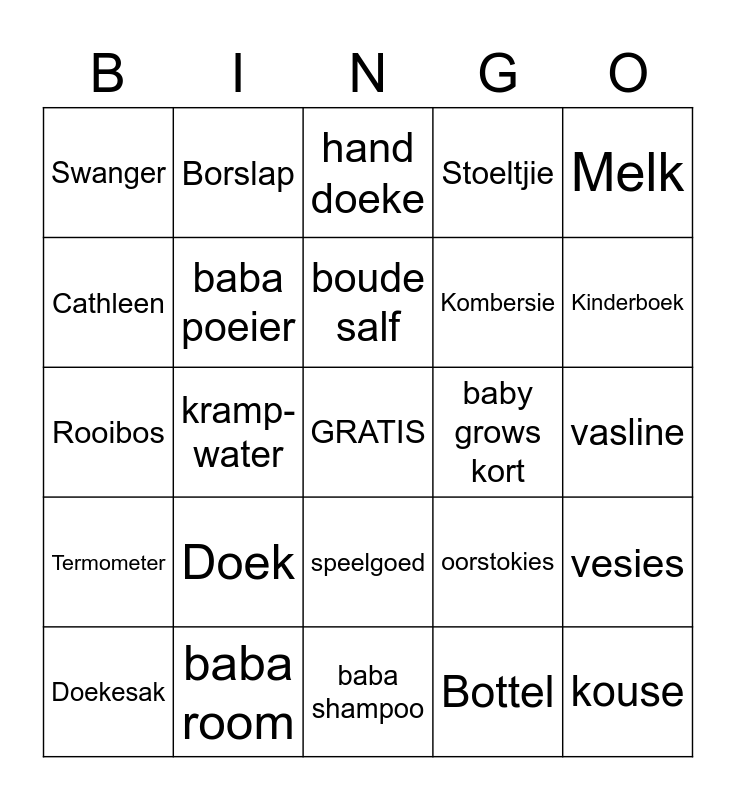 This bingo card has a free space and 24 words: Doekesak, Doek, boude salf, Bottel, Melk, Swanger, Borslap, hand doeke, baby grows kort, vasline, Rooibos, baba poeier, oorstokies, vesies, Cathleen, baba room, baba shampoo, Stoeltjie, Kinderboek, Termometer, kramp- water, speelgoed, Kombersie and kouse.