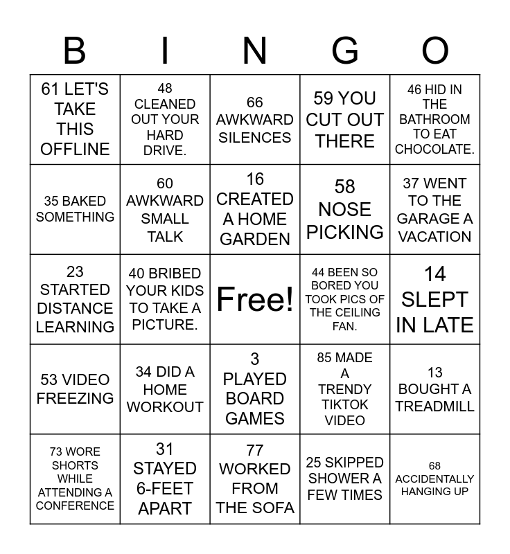 This bingo card has a free space and 86 words: 1 WORE A FACE MASK, 2 LEARNED A NEW LANGUAGE, 3 PLAYED BOARD GAMES, 4 YOU CRIED A LOT, 5 YOU STARTED JOURNALING, 6 MADE A POST-QUARANTINE BUCKET LIST, 7 SELF-ISOLATED FOR 2 WEEKS, 8 PLAYED VIDEO GAMES, 9 ATTENDED A VIRTUAL WEDDING, 10 WENT ON A PROTEST, 11 TRIED YOGA, 12 CUT YOUR OWN HAIR, 13 BOUGHT A TREADMILL, 14 SLEPT IN LATE, 15 READ A BOOK, 16 CREATED A HOME GARDEN, 17 REARRANGED FURNITURE, 18 PAINTED A PICTURE, 19 ADOPTED A DOG, 20 TOOK PET FOR A WALK, 21 TRIED A NEW RECIPE, 22 CANCELLED TRAVEL PLANS, 23 STARTED DISTANCE LEARNING, 24 TOOK AN ONLINE COURSE, 25 SKIPPED SHOWER A FEW TIMES, 26 WASHED HANDS OFTEN, 27 JOINED AN ONLINE DATING SITE, 28 TOOK MY TEMPERATURE, 29 BOUGHT EXTRA HAND SANITIZERS, 30 FORGOT WHAT DAY IT WAS, 31 STAYED 6-FEET APART, 32 VIDEO CHAT WITH FRIENDS, 33 GOT TESTED FOR COVID, 34 DID A HOME WORKOUT, 35 BAKED SOMETHING, 36 DONATED TO CHARITY, 37 WENT TO THE GARAGE A VACATION, 38 ASKED ALEXA WHAT DAY IT WAS., 39 HAD A CONVERSATION WITH THE DOG., 40 BRIBED YOUR KIDS TO TAKE A PICTURE., 41 LOST YOUR MIND., 42 ORDERED SOMETHING USELESS ON AMAZON., 43 REHEATED YOUR COFFEE MORE THAN 7 TIMES., 44 BEEN SO BORED YOU TOOK PICS OF THE CEILING FAN., 45 PAID A CHILD TO LEAVE YOU ALONE., 46 HID IN THE BATHROOM TO EAT CHOCOLATE., 47 PRETTY FOR LIFE, 48 CLEANED OUT YOUR HARD DRIVE., 49 YOU'RE ON MUTE, 50 ARE WE ALL HERE?, 51 PETS ON CAMERA, 52 MEETING RUNS OVER TIME, 53 VIDEO FREEZING, 54 MID-MEETING SNACKS, 55 ZOOMING FROM BED, 56 SOMEONE ARGUING WITH THEIR WIFE, 57 SORRY, ARE YOU TALKING TO ME?, 58 NOSE PICKING, 59 YOU CUT OUT THERE, 60 AWKWARD SMALL TALK, 61 LET'S TAKE THIS OFFLINE, 62 CHILDREN IN BACKGROUND, 63 FUN BACKGROUNDS, 64 TALKING OVER EACH OTHER, 65 I HAVE ANOTHER CALL NOW, 66 AWKWARD SILENCES, 67 TOILET BREAKS, 68 ACCIDENTALLY HANGING UP, 69 VERY LOUD TYPING, 70 CREATED A 'WORKING FROM HOME' MUSIC PLAYLIST, 71 DIDN'T SHOWER BEFORE STARTING THE DAY, 72 CELEBRATED A TEAM: MATE'S BIRTHDAY VIRTUALLY, 73 WORE SHORTS WHILE ATTENDING A CONFERENCE, 74 HAD A MEETING INTERRUPTED BY A RELATIVE OR A PET, 75 DID YOGO WHILE SITTING ON A CHAIR, 76 DRANK A BEER WHILE FINISHING UP A WORK THING, 77 WORKED FROM THE SOFA, 78 TOOK A CALL WHILE WALKING AROUND THE HOUSE, 79 SLEPT IN AND STARTED WORK LATE, 80 SHARED A VIRTUAL LUNCH WITH A COLLEAGUE, 81 WORKED FROM ANOTHER PLACE OTHER THAN HOME, 82 WEARS A BLANKET TO WORK COMFORTABLY, 83 HAS STARTED TO PRACTICE A NEW SPORT, 84 RUN OUT OF BATTERY DURING A MEETING, 85 MADE A TRENDY TIKTOK VIDEO and 86 HAD POWER/ INTERNET CUTOUT DURING A ZOOM CALL.