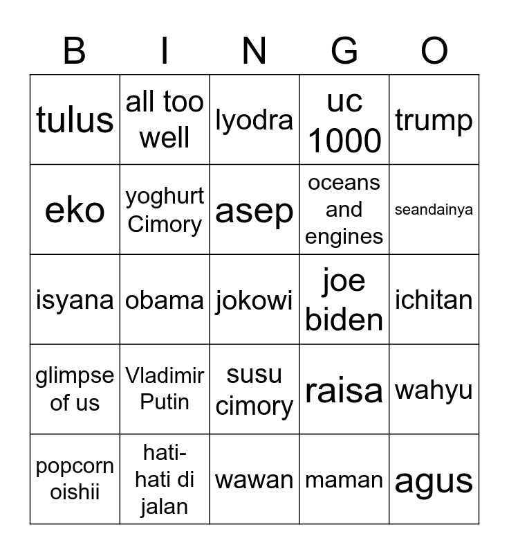 This bingo card has a free space and 24 words: Vladimir Putin, hati-hati di jalan, asep, popcorn oishii, trump, tulus, eko, all too well, joe biden, susu cimory, oceans and engines, isyana, raisa, wahyu, yoghurt Cimory, maman, ichitan, lyodra, seandainya, obama, agus, glimpse of us, uc 1000 and wawan.