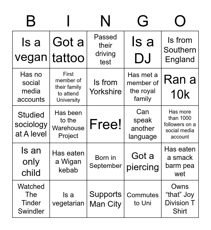 This bingo card has a free space and 37 words: went on vacation this summer in Spain, Born in North Manchester, Born in South Manchester, First member of their family to attend University, Has eaten a smack barm pea wet, Has eaten a Wigan kebab, Is from Yorkshire, Is from the Midlands, Is from Southern England, Reads the newspaper, Has been to the Warehouse Project, Is a DJ, Owns “that” Joy Division T Shirt, Has more than 1000 followers on a social media account, Has no social media accounts, Is an only child, Has more than 2 siblings, Passed their driving test, Born in September, Can speak another language, Is a vegan, Ran a 10k, Watched The Tinder Swindler, Supports Man City, Support Man United, Commutes to Uni, Got a tattoo, Over the age of 25, Watched Stranger Things, Got a part-time job, Plays a sport, Is a vegetarian, Studied sociology at A level, Living in student accommodation, Got a piercing, Has met a member of the royal family and Visited a country in Asia.