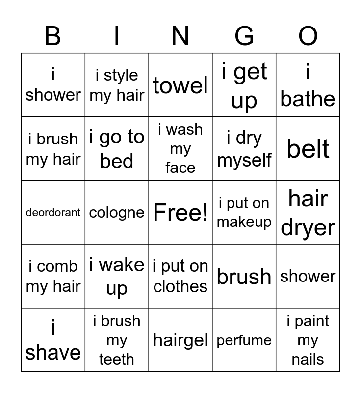 This bingo card has a free space and 24 words: i wake up, i brush my teeth, i wash my face, i shave, i bathe, i shower, i brush my hair, i style my hair, i put on makeup, i put on clothes, i dry myself, deordorant, brush, shower, i go to bed, perfume, hair dryer, towel, belt, cologne, i paint my nails, i comb my hair, i get up and hairgel.
