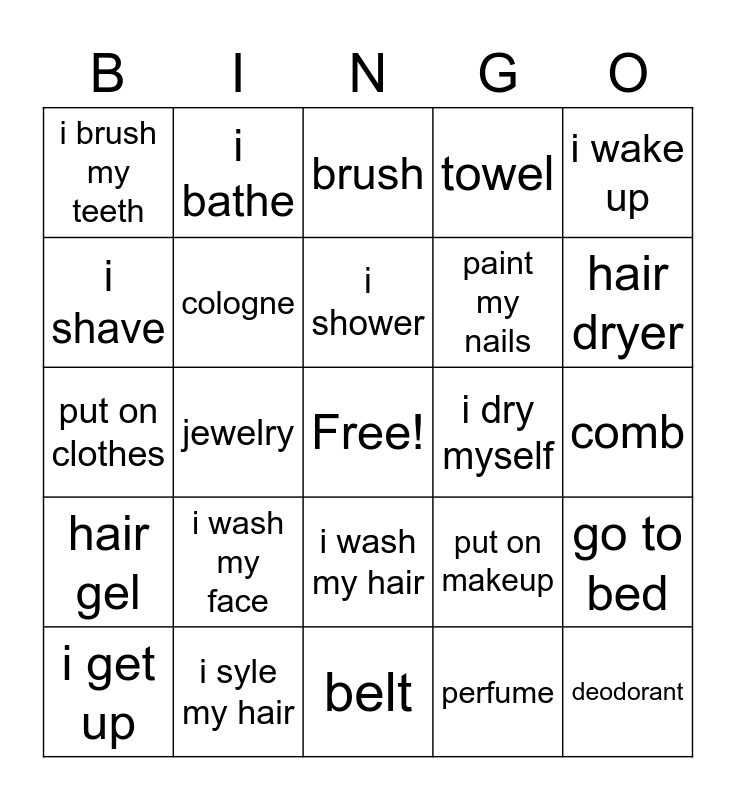This bingo card has a free space and 24 words: i wash my face, i syle my hair, i shower, i get up, i wake up, i brush my teeth, i shave, i bathe, i dry myself, i wash my hair, paint my nails, put on clothes, put on makeup, go to bed, cologne, perfume, comb, brush, hair dryer, jewelry, deodorant, hair gel, towel and belt.