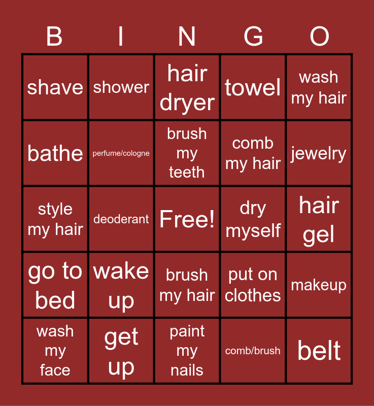 This bingo card has a free space and 24 words: wake up, get up, brush my teeth, wash my face, wash my hair, shave, bathe, shower, dry myself, brush my hair, comb my hair, style my hair, put on clothes, makeup, perfume/cologne, comb/brush, hair gel, hair dryer, jewelry, deoderant, belt, go to bed, towel and paint my nails.