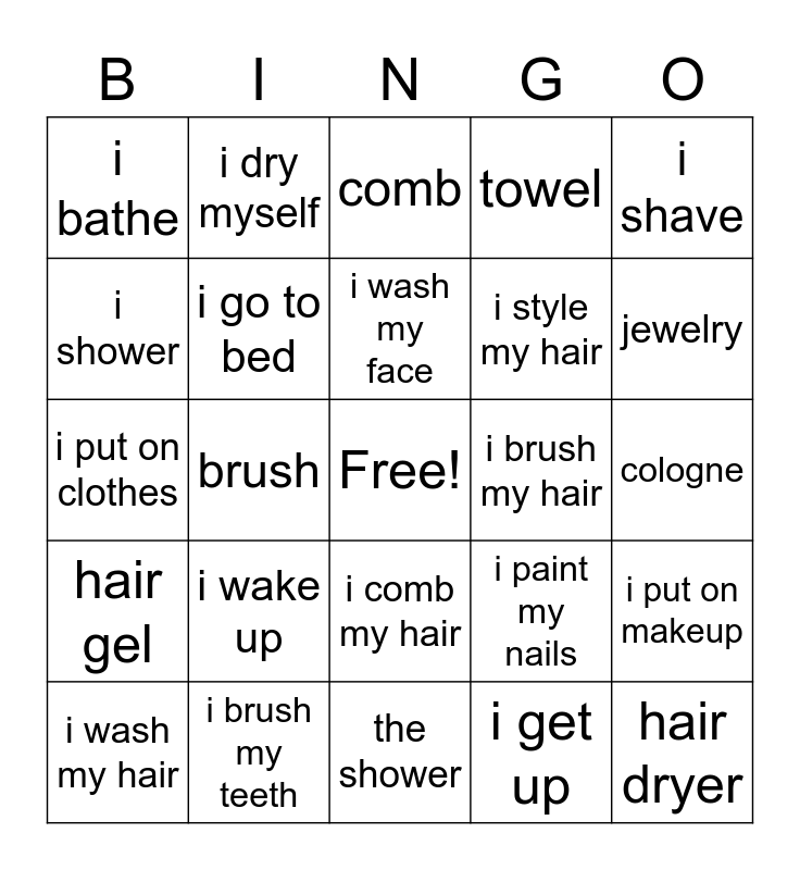This bingo card has a free space and 24 words: i wake up, i brush my teeth, i wash my face, i wash my hair, i shave, i bathe, i shower, i dry myself, i brush my hair, i comb my hair, i style my hair, i put on clothes, i paint my nails, i put on makeup, i go to bed, i get up, cologne, comb, jewelry, brush, hair dryer, hair gel, towel and the shower.