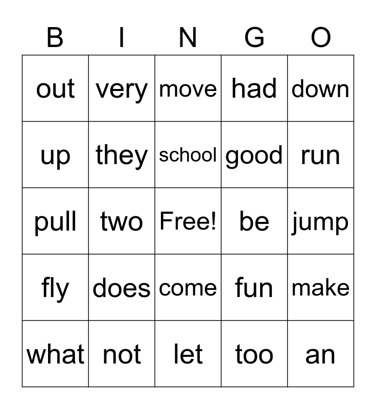 This bingo card has a free space and 24 words: does, not, school, what, down, out, up, very, be, come, good, pull, fun, make, they, too, jump, move, run, two, an, fly, had and let.