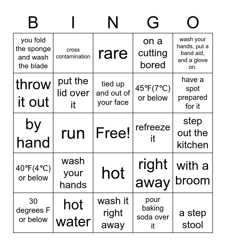 This bingo card has a free space and 24 words: wash your hands, hot water, tied up and out of your face, 30 degrees F or below, wash your hands, put a band aid, and a glove on., you fold the sponge and wash the blade, throw it out, cross contamination, refreeze it, hot, 45℉(7℃) or below, by hand, right away, with a broom, put the lid over it, pour baking soda over it, step out the kitchen, rare, have a spot prepared for it, run, a step stool, 40℉(4℃) or below, on a cutting bored and wash it right away.