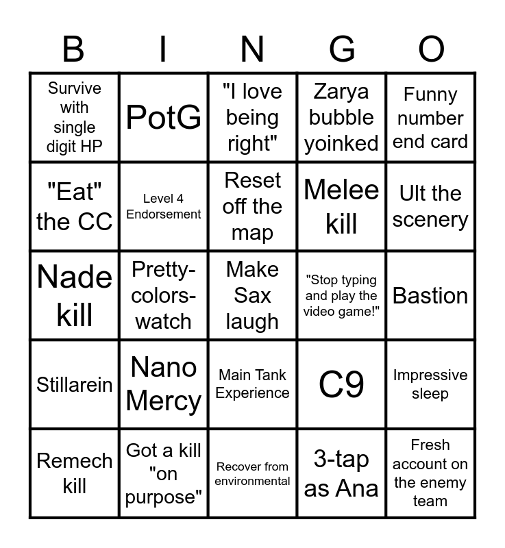 This bingo card has a free space and 24 words: Nano Mercy, Got a kill "on purpose", Reset off the map, Remech kill, Funny number end card, Survive with single digit HP, "Eat" the CC, PotG, "Stop typing and play the video game!", Main Tank Experience, Melee kill, Nade kill, C9, Impressive sleep, Level 4 Endorsement, 3-tap as Ana, Bastion, "I love being right", Ult the scenery, Pretty-colors-watch, Fresh account on the enemy team, Stillarein, Zarya bubble yoinked and Recover from environmental.