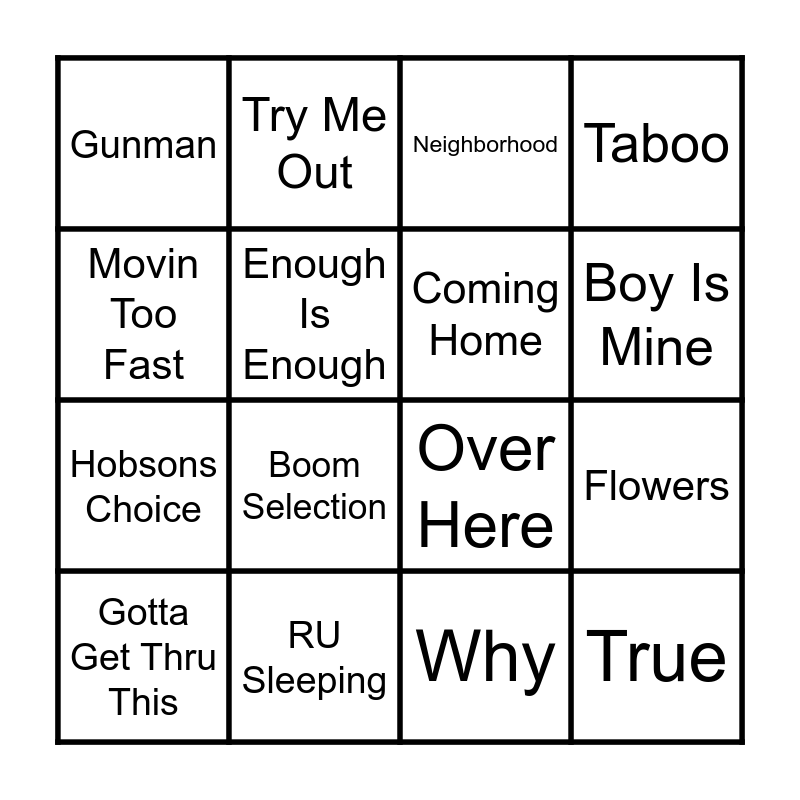 This bingo card has 20 words: Flowers, Rip Groove, Neighborhood, Never Gonna Let You Go, Gotta Get Thru This, Movin Too Fast, RU Sleeping, Gunman, Hobsons Choice, Try Me Out, Boom Selection, Over Here, Enough Is Enough, True, Coming Home, Fill Me In, Boy Is Mine, Taboo, Why and Give It Up.
