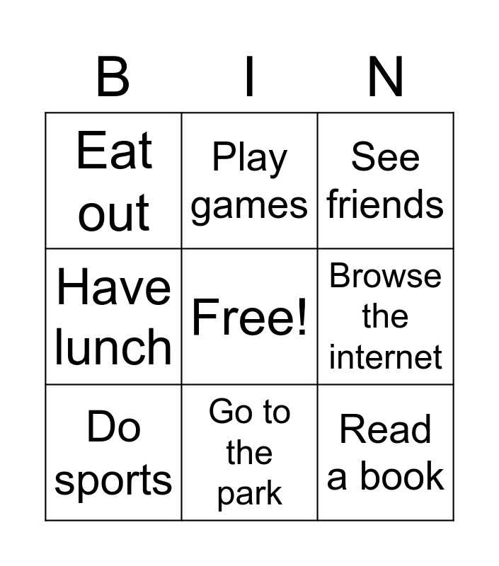 This bingo card has a free space and 15 words: See friends Eat out Go to the park Read a book Relax Work out Browse the internet Get up Go to school Have lunch Do sports Play games, Do the homework, See friends, Eat out, Go to the park, Read a book, Relax, Work out, Browse the internet, Get up, Go to school, Have lunch, Do sports, Play games and Do the homework.