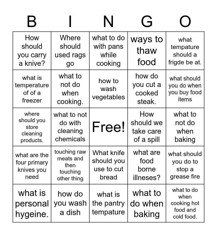 This bingo card has a free space and 24 words: touching raw meats and then touching other thing, how do you wash a dish, how to wash vegetables, what is personal hygeine., what tempature should a frigde be at., How should you carry a knive?, what is temperature of of a freezer, Where should used rags go, How should we take care of a spill, What knife should you use to cut bread, how do you cut a cooked steak., where should you store cleaning products., what are food borne illneses?, what should you do to stop a grease fire, what to not do when cooking., what to do when baking, what to not do when baking, what to do with pans while cooking, what should you do when you buy food items, what to not do with cleaning chemicals, what to do when cooking hot food and cold food., what are the four primary knives you need, ways to thaw food and what is the pantry tempature.
