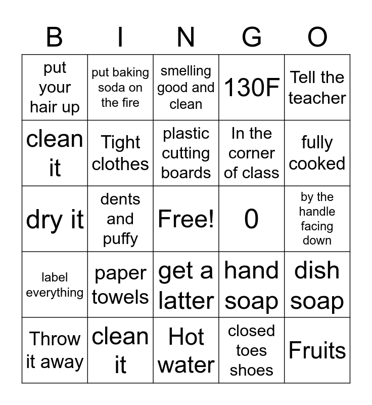 This bingo card has a free space and 24 words: paper towels, clean it, plastic cutting boards, Throw it away, Tell the teacher, put your hair up, clean it, put baking soda on the fire, 0, get a latter, In the corner of class, dry it, hand soap, dish soap, Tight clothes, closed toes shoes, by the handle facing down, smelling good and clean, fully cooked, dents and puffy, Fruits, label everything, 130F and Hot water.