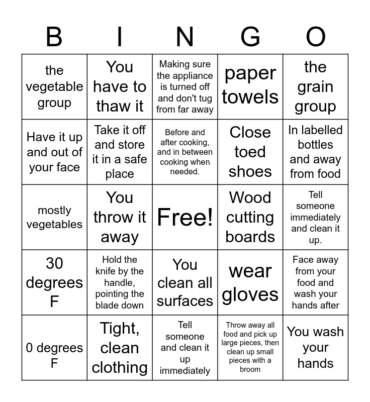 This bingo card has a free space and 24 words: Hold the knife by the handle, pointing the blade down, Tight, clean clothing, Before and after cooking, and in between cooking when needed., 0 degrees F, the grain group, the vegetable group, Have it up and out of your face, You have to thaw it, Wood cutting boards, You clean all surfaces, Close toed shoes, mostly vegetables, wear gloves, Face away from your food and wash your hands after, Take it off and store it in a safe place, Throw away all food and pick up large pieces, then clean up small pieces with a broom, Tell someone immediately and clean it up., Making sure the appliance is turned off and don't tug from far away, In labelled bottles and away from food, You throw it away, You wash your hands, 30 degrees F, paper towels and Tell someone and clean it up immediately.