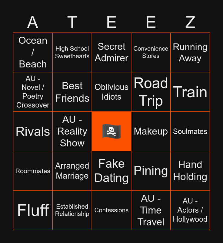 This bingo card has a free space and 92 words: Angst, Character Study, Confessions, Domesticity, Drinking Games, Feelings Realization, Flirting, Fluff, Happy Ending, Hurt / Comfort, Meet Cute, Reunion, Revenge, Road Trip, Rumors / Gossip, Running Away, Secret Admirer, Secrets, Sharing a Bed, Single Parent, Slice of Life, Slow Burn, Snowed In, Truth or Dare, Arranged Marriage, Best Friends, Breaking Up, Childhood Friends, Coworkers, Enemies to Lovers, Established Relationship, Fake Dating, First Date, Growing Old Together, High School Sweethearts, Long Distance, Married, Neighbors, Oblivious Idiots, Pining, Rivals, Roommates, Soulmates, Teammates, AU - Actors / Hollywood, AU - Angels / Demons, AU - Artists, AU - College, AU - Criminals, AU - Dystopia, AU - Gods / Demigods, AU - Hanahaki Disease, AU - Heroes / Villains, AU - Historical, AU - Horror / Thriller, AU - Medical Professionals, AU - Movie / TV Show Crossover, AU - Novel / Poetry Crossover, AU - Pirates, AU - Reality Show, AU - Reincarnation, AU - Royalty, AU - Sports, AU - Superpowers, AU - Tattoo Parlor / Flower Shop, AU - Time Travel, 5 + 1, Anniversary, Bandages, Bars / Restaurants, Bubble Baths, Concerts, Convenience Stores, Fireworks, Flowers, Food / Cooking, Hand Holding, Holidays, Kissing, Lollipops, Love Languages, Makeup, Ocean / Beach, Pets / Animals, Piercings, Rooftops, Scars, Snow Storms / Blizzards, Tattoos, Thunder / Rain Storms, Train and Weddings.