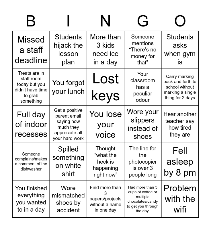 This bingo card has 42 words: Free!, Lost keys, Called kid by the wrong name, Spilled something on white shirt, Had more than 5 cups of coffee or multiple chocolates/candy to get you through the day., Fell asleep by 8 pm, You lose your voice, Smart board malfunctions, More than 3 kids need ice in a day, Thought “what the heck is happening right now”, Hear another teacher say how tired they are, Carry marking back and forth to school without marking a single thing for 2 days, Get a positive parent email saying how much they appreciate all your hard work, Students asks when gym is, Someone want to schedule a meeting for Friday after school, The line for the photocopier is over 3 people long, You cause a jam in the photocopier, Full day of indoor recesses, Dressed totally inappropriate for the weather, Students hijack the lesson plan, Treats are in staff room today but you didn’t have time to grab something, One of your favourite Flair pens dies/disappears, Problem with the wifi, Missed a staff deadline, Forgot to hand in timesheet, Someone comments that you look tired, Your classroom has a peculiar odour, You brought a coffee or treat for a cherished collègue, Spent your own money on something for your classroom, Day was blissfully uneventful, lessons and activities all went perfectly and all your work was done between the hours of 8 am to 4 pm, You finished your “To-do” list, Someone complains/makes a comment of the dishwasher, You forgot your lunch, Find more than 3 papers/projects without a name in one day, Student work blows your socks off, You finished everything you wanted to in a day, Wore mismatched shoes by accident, Wore your slippers instead of shoes, Photocopier is out of ink, Print Services order was late, Someone mentions “There’s no money for that” and Got the call from office about forgetting your attendence.