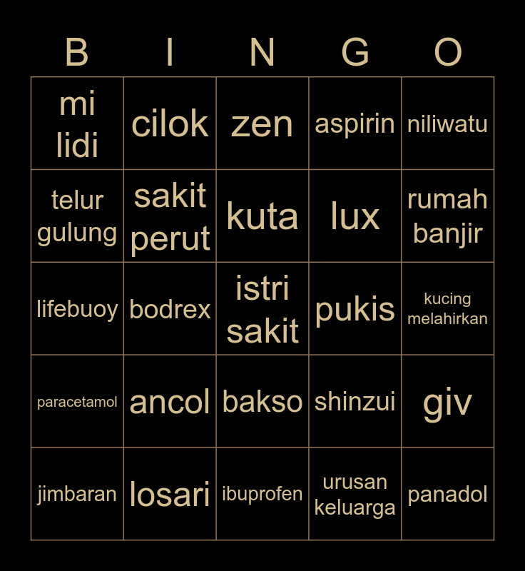 This bingo card has a free space and 24 words: ancol, losari, kuta, jimbaran, niliwatu, mi lidi, telur gulung, cilok, pukis, bakso, lux, lifebuoy, shinzui, giv, sakit perut, urusan keluarga, kucing melahirkan, zen, rumah banjir, bodrex, panadol, paracetamol, aspirin and ibuprofen.