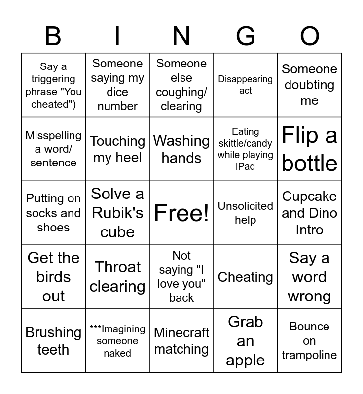 This bingo card has a free space and 24 words: Throat clearing, ***Imagining someone naked, Washing hands, Brushing teeth, Someone doubting me, Say a triggering phrase "You cheated"), Misspelling a word/ sentence, Someone saying my dice number, Unsolicited help, Not saying "I love you" back, Eating skittle/candy while playing iPad, Putting on socks and shoes, Cheating, Say a word wrong, Touching my heel, Grab an apple, Cupcake and Dino Intro, Someone else coughing/ clearing, Flip a bottle, Solve a Rubik's cube, Bounce on trampoline, Get the birds out, Disappearing act and Minecraft matching.