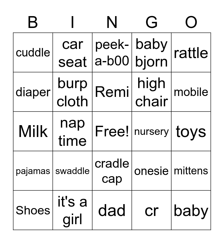 This bingo card has a free space and 52 words: bottle, baby, mom, dad, swaddle, crib, car seat, stroller, diaper, wipes, burp cloth, playpen, mittens, onesie, booties, blanket, Remi, nursery, bath time, rattle, nap time, cr, cuddle, high chair, socks, ultrasound, formula, bassinet, mobile, stork, teddy bear, baby bjorn, walker, bouncer, rainbow, peek-a-b00, it's a girl, breast pump, tummy time, crawl, towel, toys, pajamas, sippy cup, cradle cap, Bib, Lullaby, Milk, Newborn, Teether, Shoes and Labor.