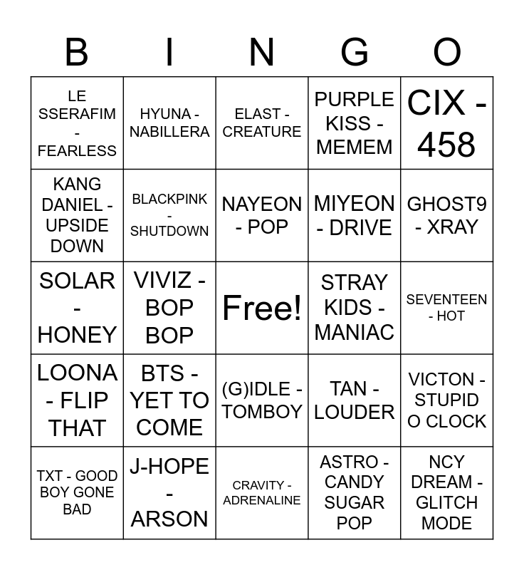 This bingo card has a free space and 24 words: BTS - YET TO COME, J-HOPE - ARSON, NAYEON - POP, TXT - GOOD BOY GONE BAD, CIX - 458, LE SSERAFIM - FEARLESS, KANG DANIEL - UPSIDE DOWN, HYUNA - NABILLERA, STRAY KIDS - MANIAC, (G)IDLE - TOMBOY, MIYEON - DRIVE, SOLAR - HONEY, TAN - LOUDER, VICTON - STUPID O CLOCK, BLACKPINK - SHUTDOWN, ASTRO - CANDY SUGAR POP, SEVENTEEN - HOT, ELAST - CREATURE, GHOST9 - XRAY, VIVIZ - BOP BOP, NCY DREAM - GLITCH MODE, LOONA - FLIP THAT, PURPLE KISS - MEMEM and CRAVITY - ADRENALINE.