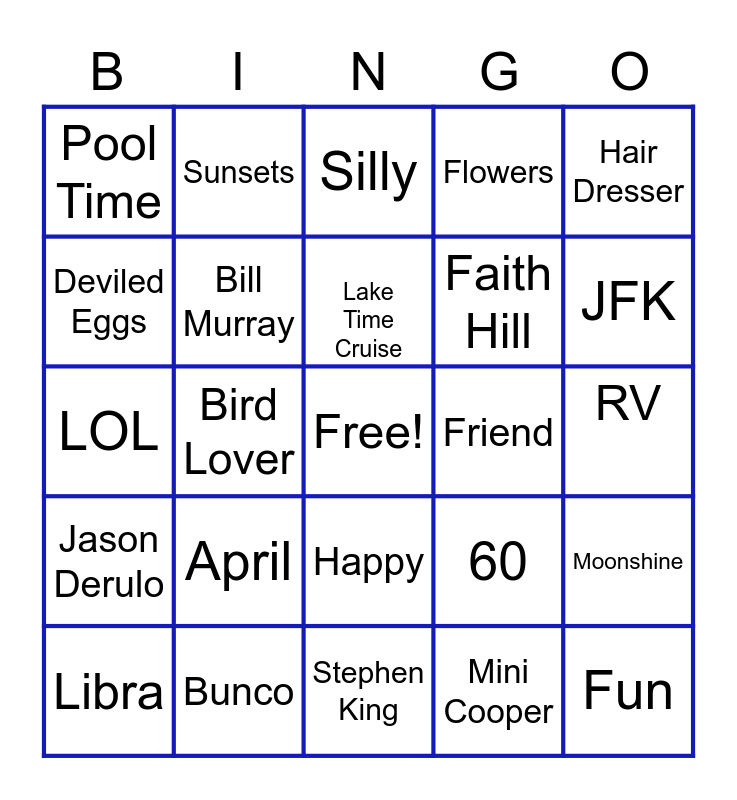 This bingo card has a free space and 29 words: Libra, Girl Time, Bird Lover, Pontoon Queen, Pool Time, Silly, Bill Murray, April, Friend, Bunco, RV, Fun, Stephen King, Mini Cooper, JFK, Sept 21, Happy, Jason Derulo, Hair Dresser, LOL, 60, Jester, Faith Hill, Deviled Eggs, Flowers, Sunsets, Moonshine, Lake Time Cruise and Green Eyes.