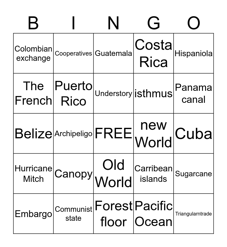 This bingo card has a free space and 24 words: Canopy, Communist state, Understory, Embargo, Hispaniola, Colombian exchange, The French, Cooperatives, new World, Old World, isthmus, Belize, Carribean islands, Sugarcane, Puerto Rico, Pacific Ocean, Cuba, Guatemala, Panama canal, Archipeligo, Triangularntrade, Hurricane Mitch, Costa Rica and Forest floor.