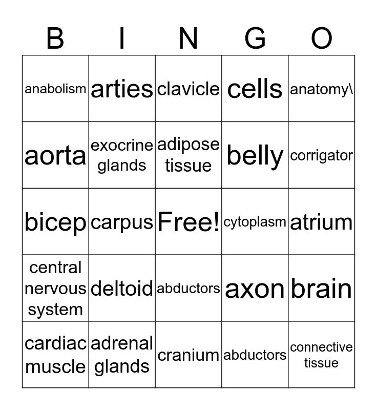 This bingo card has a free space and 26 words: abductors, abductors, adipose tissue, adrenal glands, anatomy\, anabolism, aorta, arties, atrium, axon, belly, bicep, brain, cardiac muscle, carpus, canabolism, cells, central nervous system, clavicle, connective tissue, corrigator, cranium, cytoplasm, deltoid, exocrine glands and frontalis.