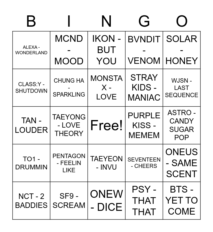 This bingo card has a free space and 24 words: PENTAGON - FEELIN LIKE, SF9 - SCREAM, MONSTA X - LOVE, NCT - 2 BADDIES, SOLAR - HONEY, ALEXA - WONDERLAND, CLASS:Y - SHUTDOWN, MCND - MOOD, PURPLE KISS - MEMEM, TAEYEON - INVU, STRAY KIDS - MANIAC, TAN - LOUDER, SEVENTEEN - CHEERS, ONEUS - SAME SCENT, CHUNG HA - SPARKLING, PSY - THAT THAT, ASTRO - CANDY SUGAR POP, IKON - BUT YOU, WJSN - LAST SEQUENCE, TAEYONG - LOVE THEORY, BTS - YET TO COME, TO1 - DRUMMIN, BVNDIT - VENOM and ONEW - DICE.