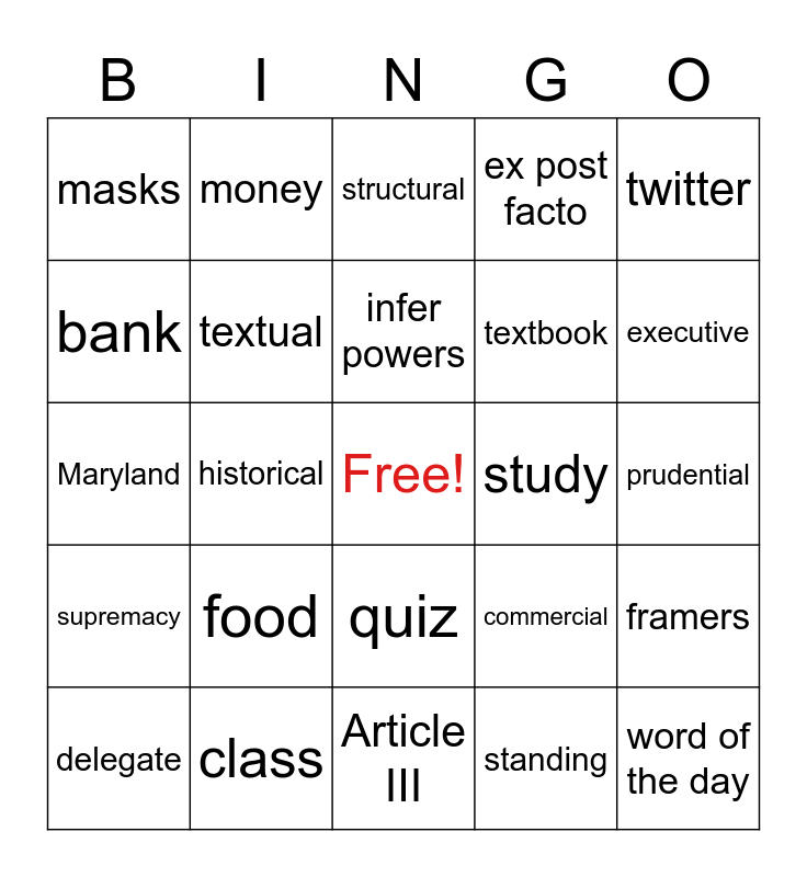 This bingo card has a free space and 24 words: food, class, infer powers, delegate, twitter, masks, bank, money, study, quiz, textbook, Maryland, commercial, framers, textual, standing, prudential, structural, executive, historical, word of the day, supremacy, ex post facto and Article III.