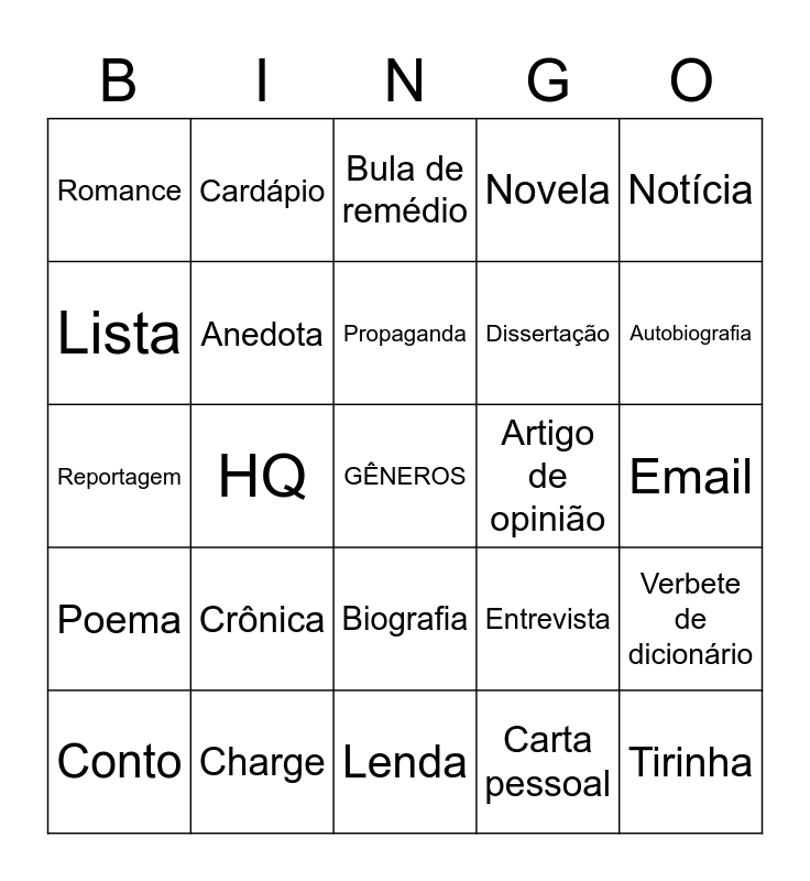 This bingo card has a free space and 29 words: Conto, Fábula, HQ, Cartum, Romance, Bula de remédio, Anedota, Crônica, Artigo de opinião, Charge, Email, Tirinha, Lenda, Carta pessoal, Autobiografia, Convite, Biografia, Poema, Notícia, Reportagem, Entrevista, Estatuto, Dissertação, Lista, Novela, Cardápio, Verbete de dicionário, Propaganda and Anúncio Publicitário.