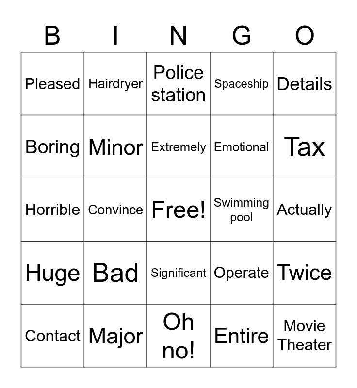 This bingo card has a free space and 171 words: Accent, Accompany, Accurate, Actor, Actually, Alter, Basic, Detail, Each other, Emotional, Exactly, Expert, Horrible, Minor, Movie Theater, Research, Significant, Surprise, Drama, Tragedy, Set, Action, Aquarius, Scene, Tickets, Seats, Reservation, Digital, Soundtrack, Dhoby, IMAX, Drama, Spotlight, Sci-fi, Romance, Video, Cameo, Cut, Intermission, Animation, Script, Screenplay, Writer, Author, Chapter, Act, Popcorn, Camera, Lights, Dark, Horror, Comedy, Emotional, Experts, Actually, Afraid, Behave, Childhood, Contact, Get along with, Huge, Pleased, Southern, Special Effects, Avoid, In order to, Sounds, Used to, Expense, Major, Make sure, Remember to, Details, Loud, Accompany, Capital, Entire, Admire, Café, Look around, Shopping, Chance, Concert, Traffic, Accurate, Achievement, Actor, Gloves, Hairdryer, Handbag, Horrible, Huge, Minor, Operate, Police station, Railway station, Record, Seaside, Spaceship, Swimming pool, Technology, Traffic Jam, Airport, Alter, Appreciate, Basic, Behave, Chat, Contact, Exactly, Enjoy, Sense, Adventure, Last, Pleased, Apologize, Condition, Encourage, Minister, Terrible, Truth, Twice, President, Tax, Tell, Otherwise, Fight, Even, Hug, Invent, Be responsible for, Apologize, Condition, Convince, Doubt, Even, Afford, Enemy, Extremely, Make up, Upset, Blame, Interesting, Amazing, Bad, Great, Disappointing, Beautiful, Boring, Terrible, A shame, Online, Oh no!, Director, Book, Can’t wait, Condition, Twice, In time, Pick up, Play, Role, Lie, Invent, Be crazy about, Be responsible for, Stage, Convince, History, Trivia and Hunger.