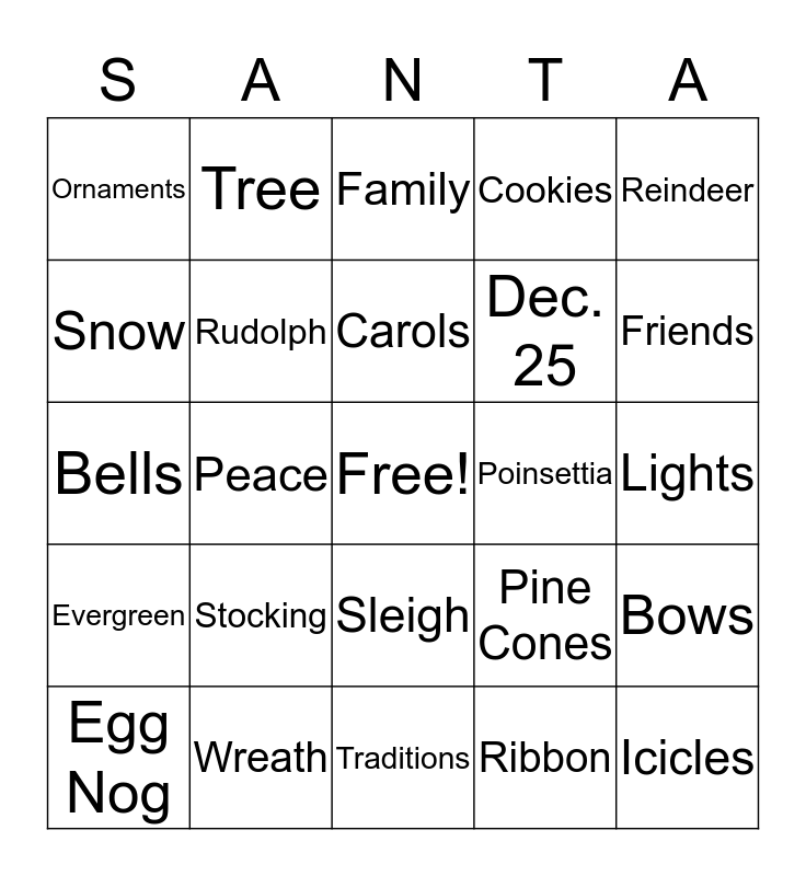 This bingo card has a free space and 24 words: Stocking, Wreath, Carols, Egg Nog, Reindeer, Ornaments, Snow, Tree, Poinsettia, Sleigh, Dec. 25, Bells, Pine Cones, Bows, Rudolph, Ribbon, Lights, Family, Friends, Peace, Icicles, Evergreen, Cookies and Traditions.