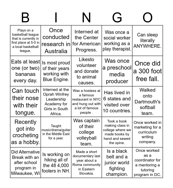 This bingo card has a free space and 24 words: Taught music/drama/guitar in the Middle East for a year., Is working on hiking all of the 48 4,000 footers in NH., Likesto volunteer and donate to animal causes., Did Alternative Break with an after school program in Milwaukee, WI, Can sleep literally ANYWHERE., Plays on a basketball league that is currently in first place at 5-0 in a local basketball league., Eats at least one (or two) bananas every day., Once conducted research in Australia, Has lived in 6 states and visited over 10 countries., Was captain of their college volleyball team., Was once a preschool media producer, Can touch their nose with their tongue., Took a book making class in college where we made books by hand and sewed the spine., Once worked in marketing for a curriculum writing company., Is most proud of their years working with Blue Engine., Is a black belt and a junior world fighting champion., Walked onto Dartmouth's softball team., Interned at the Center for American Progress., Once did a 300 foot free fall., Interned at the Oprah Winfrey Leadership Academy for Girls in South Africa., Once worked as a coordinator for a mentoring a tutoring program in DC., Recently got into crocheting as a hobby., Was once a social worker working as a play therapist. and Made a short documentary last year about a Roma community in Eastern Slovakia..