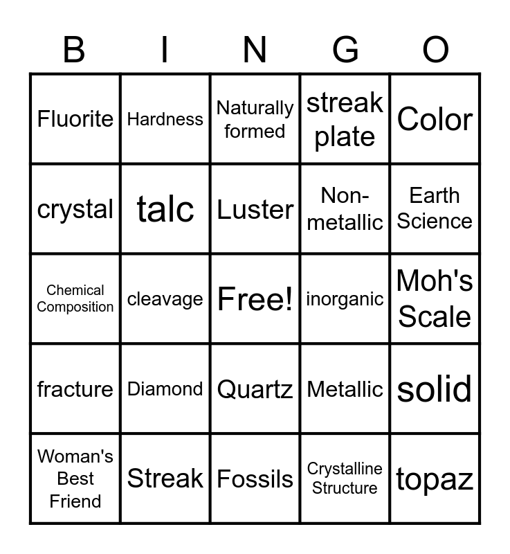 This bingo card has a free space and 24 words: Diamond, Streak, Luster, Woman's Best Friend, Color, Fluorite, crystal, Hardness, inorganic, Quartz, Non-metallic, Chemical Composition, Metallic, solid, talc, Crystalline Structure, Moh's Scale, Naturally formed, Earth Science, cleavage, topaz, fracture, streak plate and Fossils.