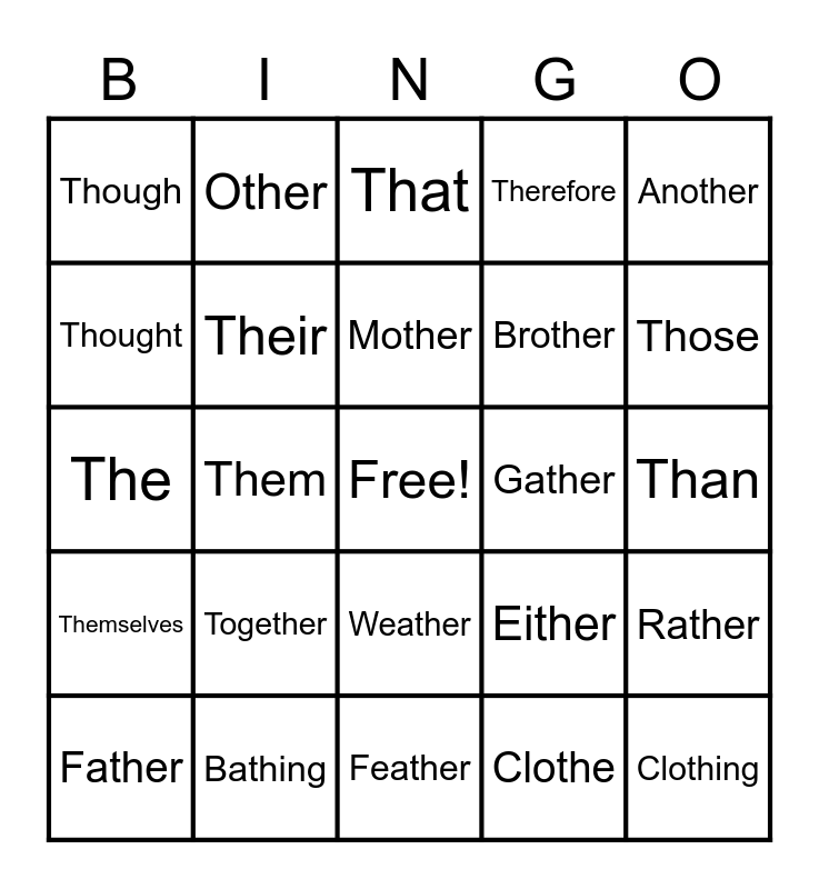 This bingo card has a free space and 25 words: Together, Feather, Mother, Father, Another, Though, Thought, Other, Gather, Weather, Brother, The, Either, Rather, Their, These, Than, That, Those, Them, Clothing, Bathing, Themselves, Therefore and Clothe.