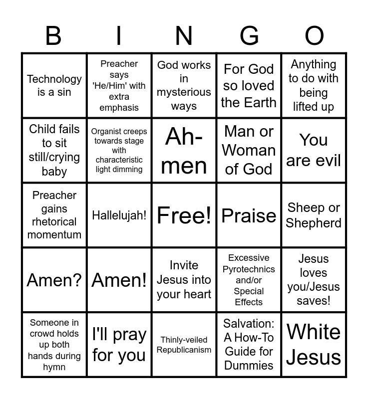 This bingo card has a free space and 24 words: Amen!, I'll pray for you, Ah-men, Someone in crowd holds up both hands during hymn, Anything to do with being lifted up, Technology is a sin, Child fails to sit still/crying baby, Preacher says 'He/Him' with extra emphasis, Praise, Invite Jesus into your heart, Man or Woman of God, Preacher gains rhetorical momentum, Excessive Pyrotechnics and/or Special Effects, Jesus loves you/Jesus saves!, Organist creeps towards stage with characteristic light dimming, Salvation: A How-To Guide for Dummies, Sheep or Shepherd, God works in mysterious ways, You are evil, Hallelujah!, White Jesus, Amen?, For God so loved the Earth and Thinly-veiled Republicanism.