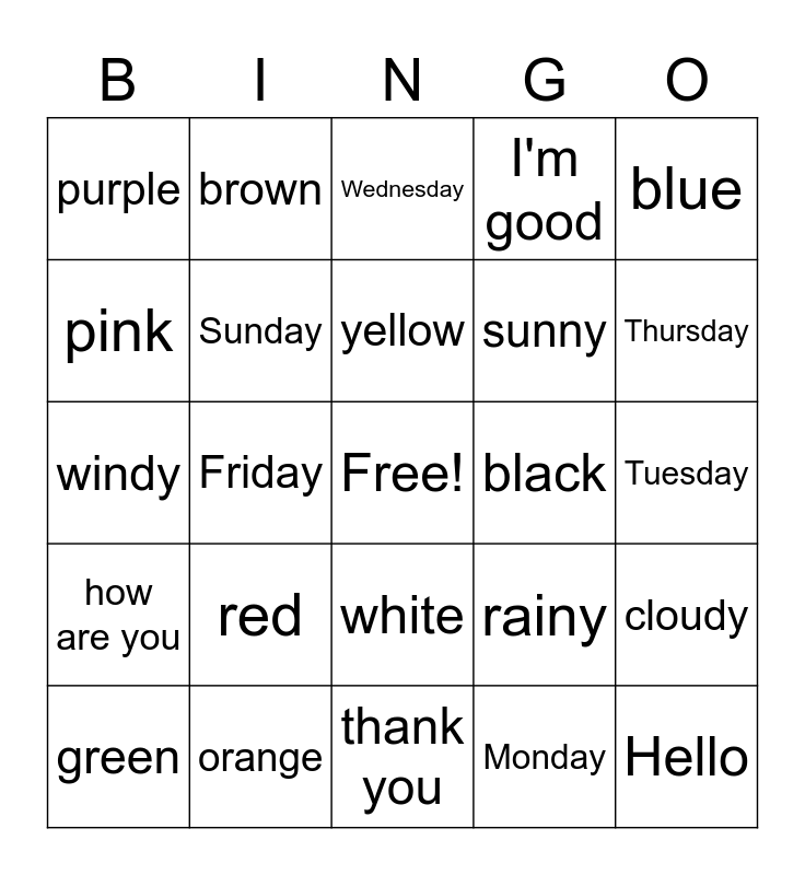 This bingo card has a free space and 24 words: red, orange, yellow, green, blue, purple, pink, brown, black, white, sunny, windy, rainy, cloudy, Sunday, Monday, Tuesday, Wednesday, Thursday, Friday, Hello, how are you, I'm good and thank you.