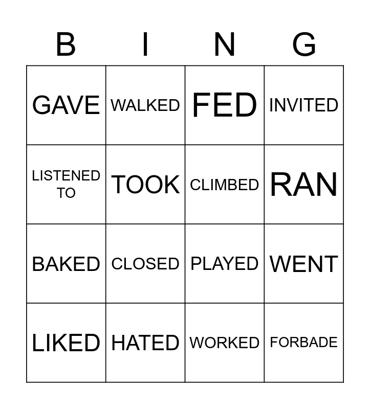This bingo card has 111 words: WAS, WERE, Free!, WAS, WERE, BEGAN, BECAME, BLEW, BROKE, BUILT, BURNT, CAME, CHOSE, COST, CUT, DID, DREW, DREAMT, DRANK, DROVE, ATE, FED, FEEL, FELT, FOUND, FORBADE, FLEW, FORGOT, FROZE, GOT, GAVE, WENT, GREW, HAD, HUNG, KNEW, LEARNT, LOST, MADE, MEANT, MET, PUT, READ, RODE, RAN, SAID, SAW, SENT, SHONE, SANG, SAT, SLEPT, SMELT, SPOKE, SPENT, STOLE, TOOK, TOLD, THREW, UNDERSTOOD, WON, WROTE, WORE, ARRIVED, ASKED, BAKED, CALLED, CHANGED, CLEANED, CLIMBED, CLOSED, COLLECTED, COOKED, COPIED, CRIED, DANCED, DECORATED, DESCRIBED, DISCOVERED, ENJOYED, FINISHED, HAPPENED, HATED, HELPED, IMAGINED, INVENTED, INVITED, JUMPED, LIKED, LIVED, LISTENED TO, LOVED, MISSED, NEEDED, OPENED, PAINTED, PLAYED, PRACTICED, PREPARED, STARTED, STUDIED, TALKED, TRAVELED, USED, VISITED, WALKED, WANTED, WASHED, WATCHED, WORKED and SWAM.