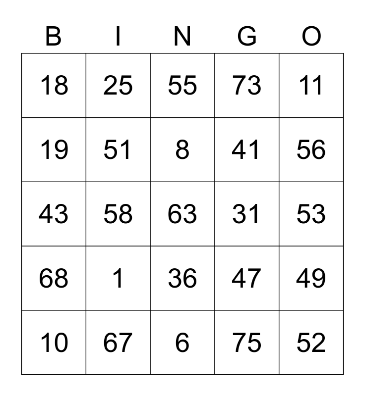 This bingo card has 25 words: 1, 6, 8, 10, 11, 18, 19, 25, 31, 36, 41, 43, 47, 49, 51, 52, 53, 55, 56, 58, 63, 67, 68, 73 and 75.
