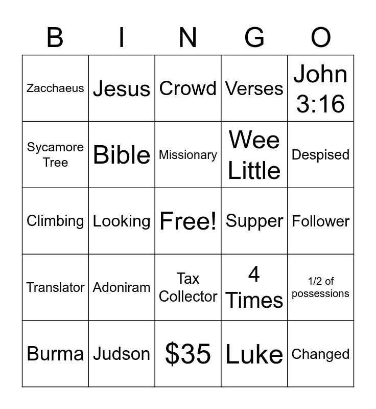 This bingo card has a free space and 24 words: Adoniram, Judson, Missionary, Burma, John 3:16, Zacchaeus, Sycamore Tree, Jesus, Supper, Tax Collector, Wee Little, Climbing, 4 Times, 1/2 of possessions, Bible, Luke, Follower, Crowd, Despised, Looking, Changed, Translator, Verses and $35.